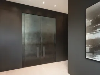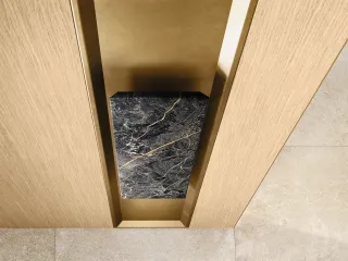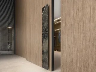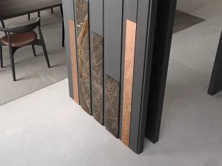 La fascia in metallo De Castelli, incassata nell’anta, richiama le componenti strutturali, diventando un inserto quasi architettonico che contribuisce a trasmettere un’immagine scultorea. Una fusione di forma e funzione che è al contempo elegante e scenografica; un’opera d’arte per elevare i sistemi di chiusura e partizione oltre il semplice accesso. L’integrazione delle maniglie in marmo Margraf aggiunge un tocco di lusso e raffinatezza, valorizzando ulteriormente l’appeal estetico e la funzionalità del design.
