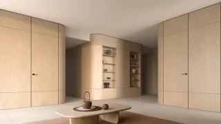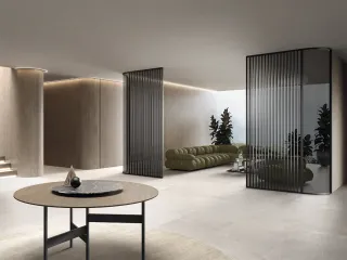 Modernità e leggerezza si esprimono nell’equilibrio tra materiali e forme, dando vita a una partizione curva in vetro e alluminio firmata Barausse. Pensata per separare gli spazi senza interrompere la continuità visiva, questa soluzione fluida e geometrica crea ambienti riservati come angoli lettura, sale d’attesa o zone living. L’elemento curvo, trasparente o satinato, si integra con ante fisse e traversini in legno o alluminio, contribuendo a definire un’atmosfera unica e armoniosa, dove il design diventa parte integrante dell’arredo.
