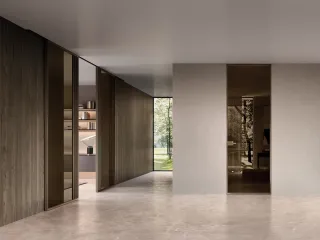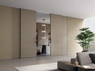 Integrata in boiserie, pannellature e ante fisse, la porta scorrevole valorizza gli spazi anche nella sua elegante versione in vetro