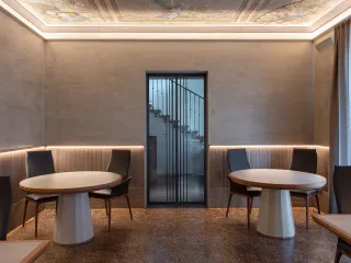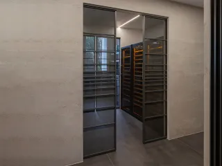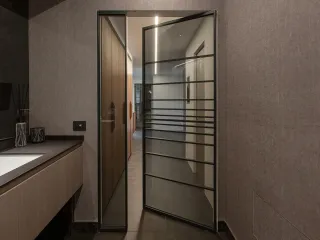 L’antico e il moderno dialogano in perfetta simbiosi, creando la scenografia perfetta per le grandi porte realizzate da Barausse; soluzioni a filomuro in vetro-alluminio e ampie vetrate scorrevoli per dividere gli eleganti spazi della villa con stile deciso e ricercato.