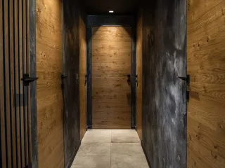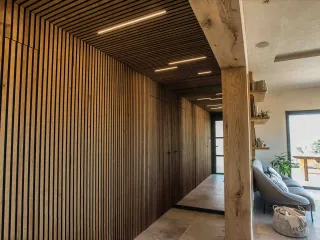 Gli ambienti interni sono valorizzati dalla luce naturale e da un design che esalta la matericità del legno, presente nelle finiture e nelle porte filomuro fornite da Barausse. Le porte in legno e le porte Secret filomuro si integrano perfettamente con lo stile dell’abitazione, creando un continuum estetico elegante e raffinato. All’esterno, la cura dei dettagli si riflette nella scelta dei materiali e nella progettazione del verde, con ampie terrazze e spazi aperti che completano l’armonia del progetto.
