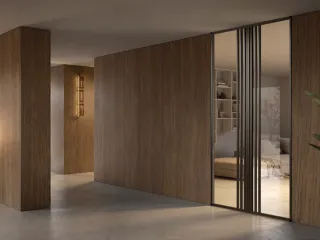 Un carter in legno coordinato con le ante offre una seconda possibilità estetica. Una stanza si apre, si divide o trova la sua configurazione intermedia.