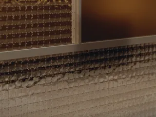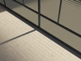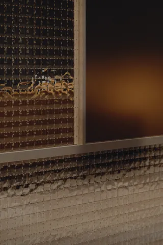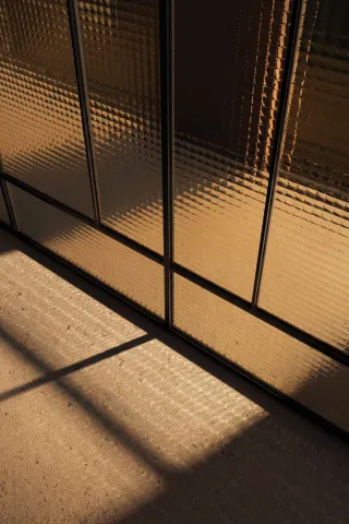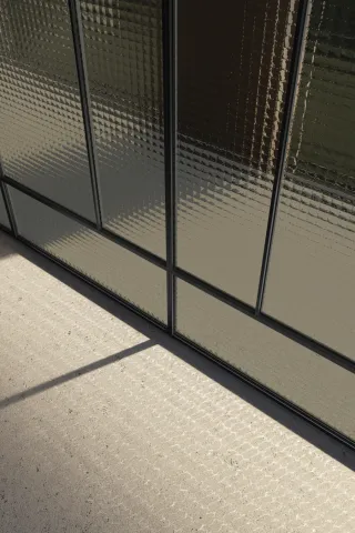 Il vetro colorato in massa, nei toni del bronzo e del fumé interagiscono con la luce in modi diversi interpretano gli ambienti invece di separarli, cambiando con l’ora del giorno e la direzione della luce.