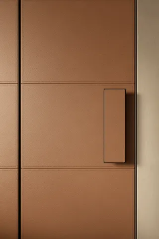 La pelle europea pregiata, tinta con metodi di lavorazione specifici, assorbe il colore in profondità e matura nel tempo con sfumature autentiche. Le cuciture artigianali, realizzate a mano con maestria, esaltano la qualità del materiale e richiamano la tradizione, elevando porte e partizioni a pezzi di design contemporaneo.