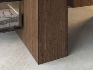 In questo ambiente il tronco si trasforma in un materiale raro, robusto e profondamente caratterizzato da tonalità scure che vanno dal marrone al nero. Barausse dona nuova vita a questo legno prezioso, utilizzandolo come superficie di design: la finitura verniciata esprime calore, matericità e profondità visiva.