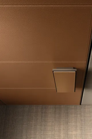 Barausse sceglie la vera pelle come materiale d’eccellenza per ante e partizioni, trasformandola in una voce materica che caratterizza l’interior. Non un semplice rivestimento, ma una superficie che definisce l’atmosfera degli ambienti.